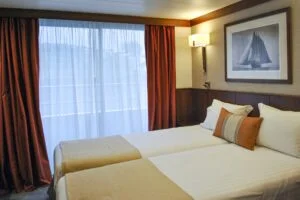 Ogni cabina, di circa 15 m², è dotata di doccia/WC, aria condizionata regolabile, asciugacapelli (se disponibile), cassaforte e TV, per garantirti il massimo della comodità durante la crociera.