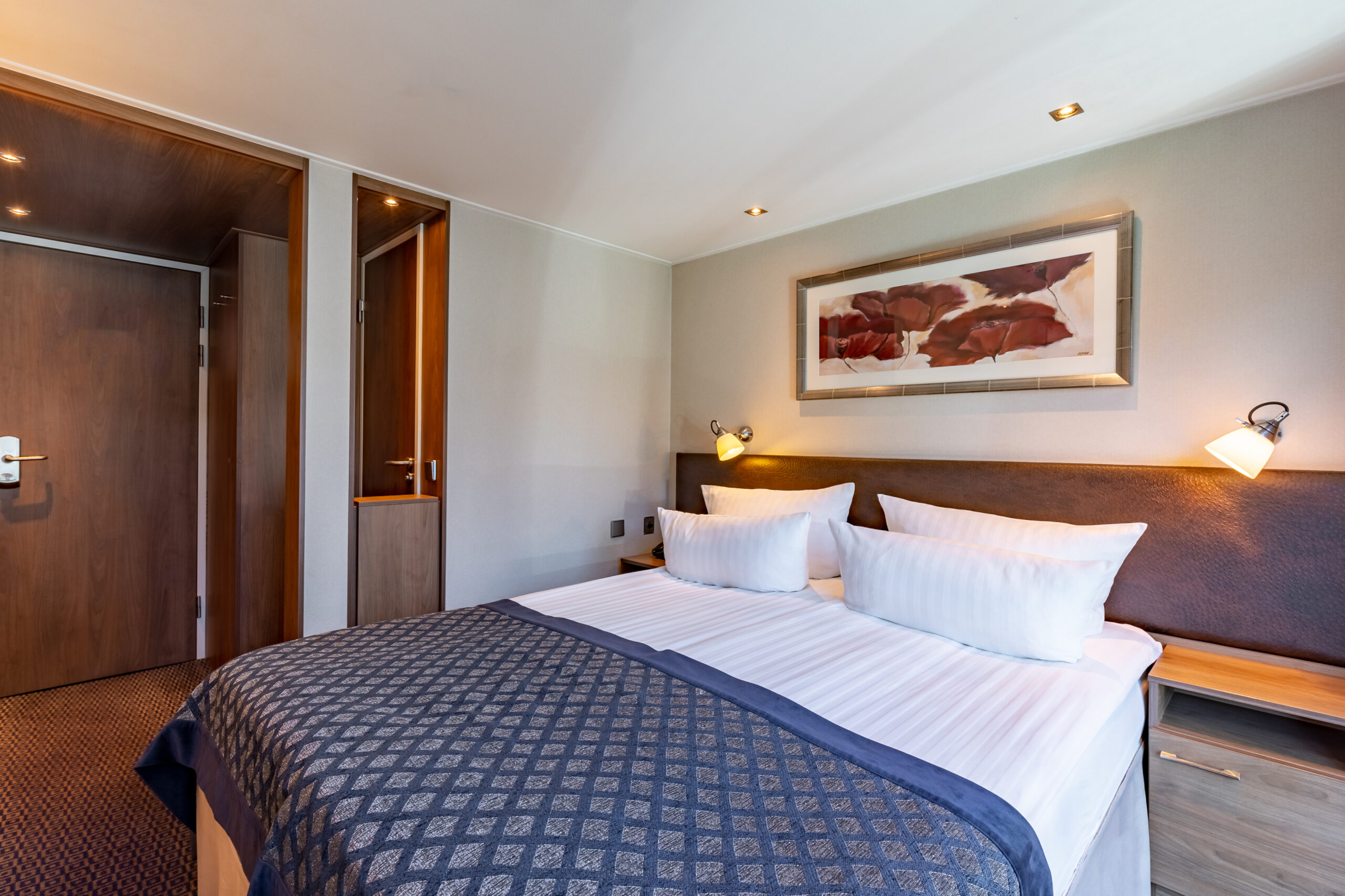 Tutte le cabine sono esterne e dispongono di doccia e WC, TV satellitare, asciugacapelli, cassaforte, telefono interno e minifrigo. Le cabine sul ponte inferiore (16 m²) hanno una finestra fissa, mentre le cabine sul ponte principale e superiore (16 m²) hanno il balcone alla francese. Sul ponte superiore si trovano 4 eleganti cabine suite di circa 24 m².