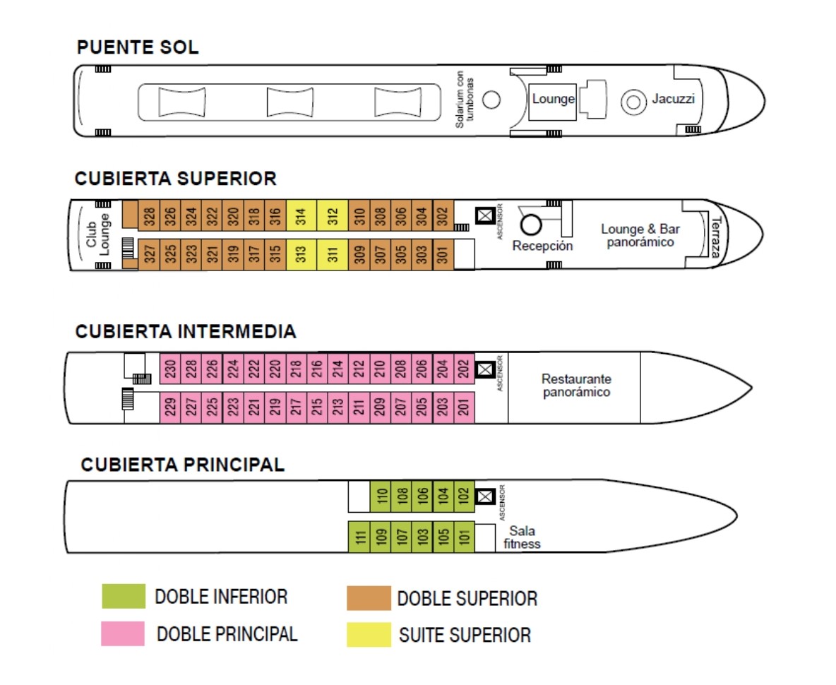 Tutte le cabine sono esterne e dispongono di doccia e WC, TV satellitare, asciugacapelli, cassaforte, telefono interno e minifrigo. Le cabine sul ponte inferiore (16 m²) hanno una finestra fissa, mentre le cabine sul ponte principale e superiore (16 m²) hanno il balcone alla francese. Sul ponte superiore si trovano 4 eleganti cabine suite di circa 24 m².